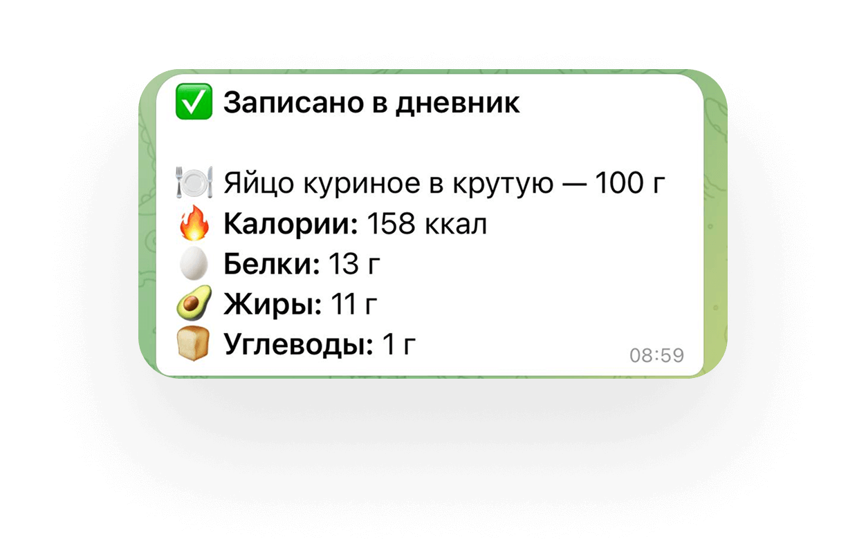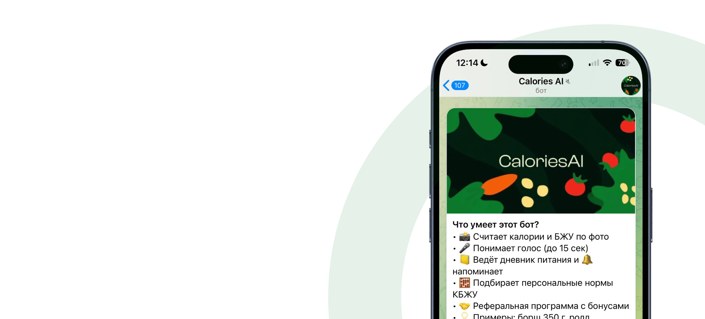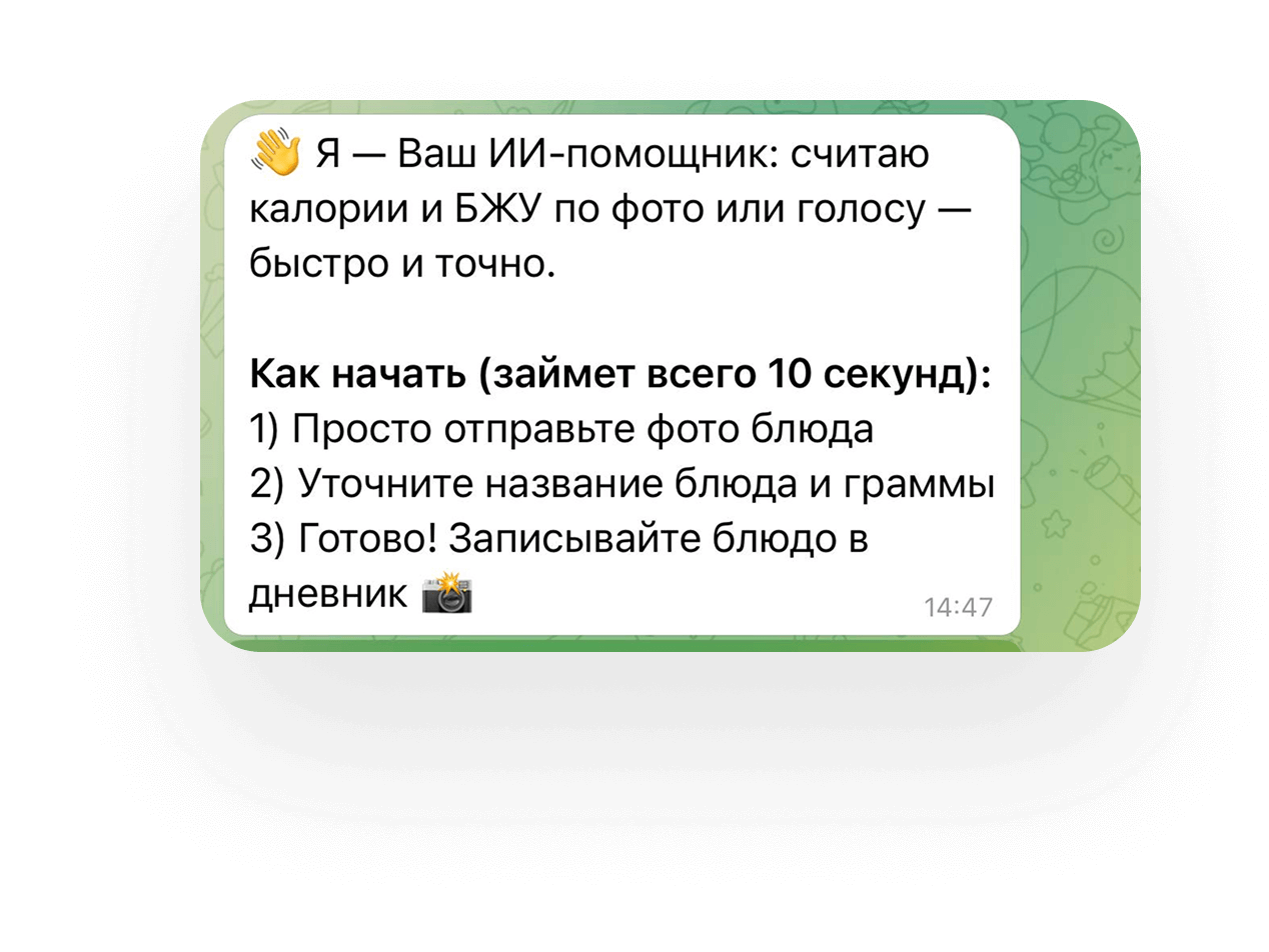 Бот распознает блюдо по фото, голосу, штрихкоду или тексту и сразу показывает калории, БЖУ и состав.