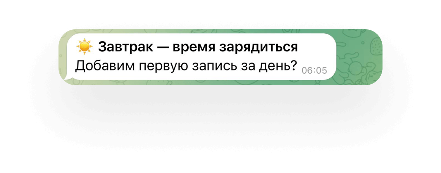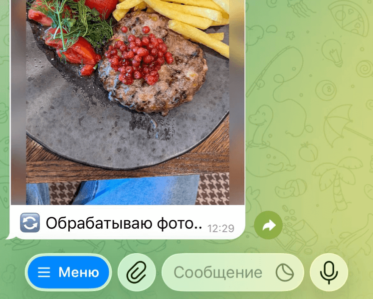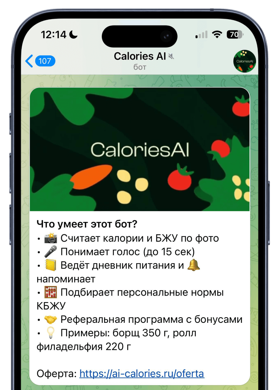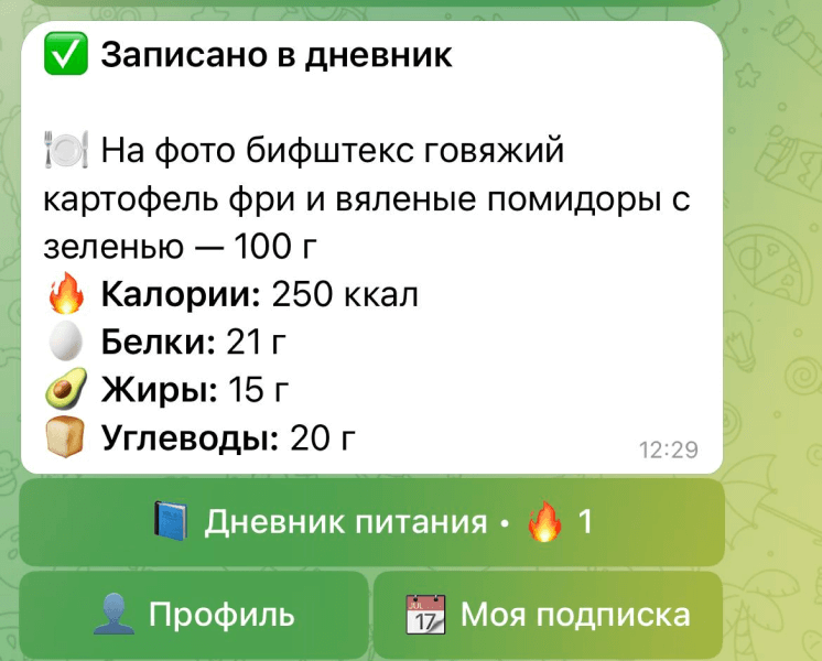 Бот распознает блюдо по фото, голосу, штрихкоду или тексту и сразу показывает калории, БЖУ и состав.